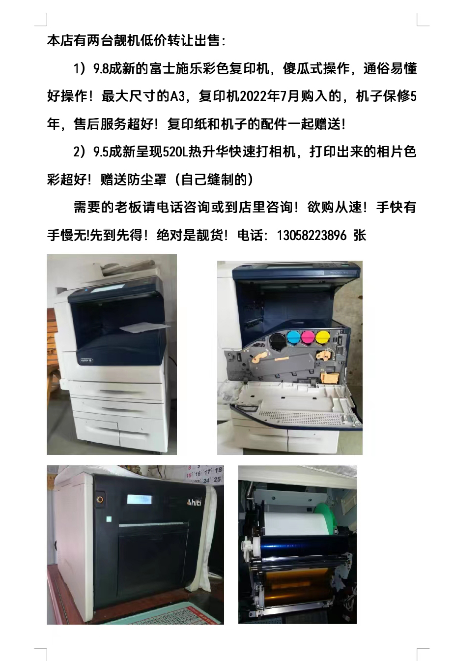 1)9.8成新的富士施樂彩色復(fù)印機(jī),傻瓜式操作,通俗易懂好操作!最大尺寸的A3,復(fù)印機(jī)2022年7月購入的,機(jī)子保修5年,售后服務(wù)超好!復(fù)印紙和機(jī)子的配件一起贈送!